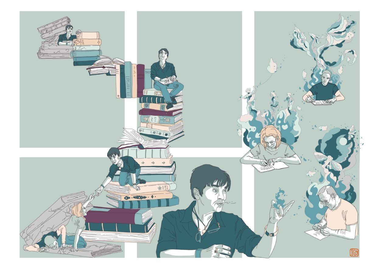 Beatrijs is de eerste leerkracht die we weer in levende lijve mogen ontmoeten voor een interview. Ze geeft schrijfcursussen voor volwassenen aan de Kunstencampus in Hasselt en is zelf schrijfster, onder andere van de young adult boeken Vals Nest (2016) en Puin (2020). Hoewel we geen bijzondere schrijfambities koesteren, voelen we ons na het gesprek toch bijna geroepen om aan te melden voor de lessen. Haar liefde voor het schrijverschap werkt aanstekelijk. Helaas blijken alle plaatsen bezet, de lessen zijn populair. Het verbaast ons niet.